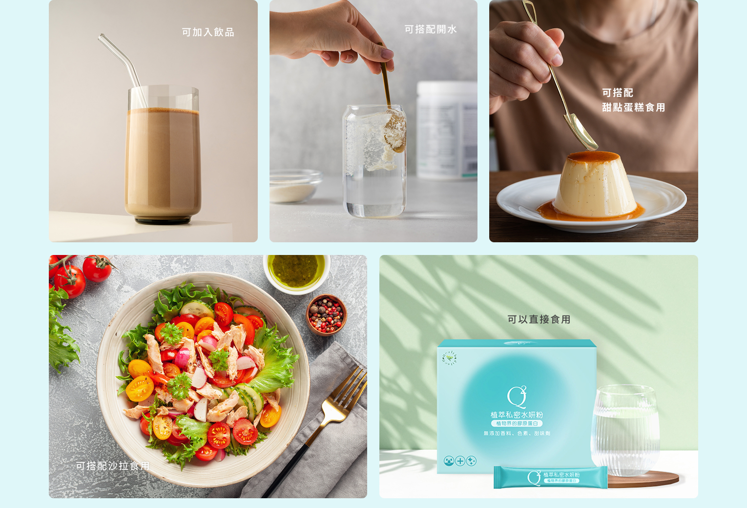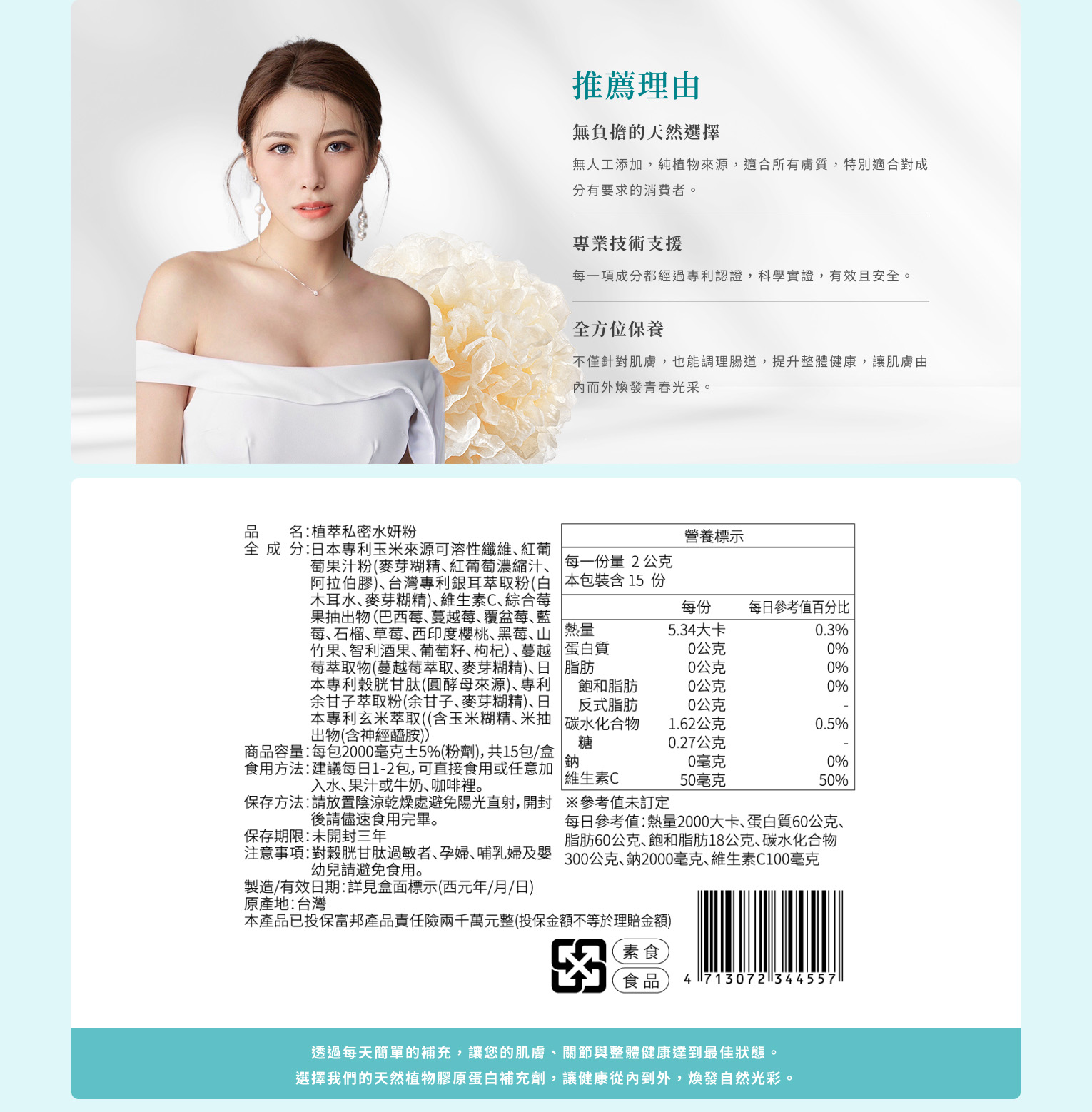 我們植物界的膠原蛋白、萃取多種大自然植物跟專利成分、無添加人工香料、色素、甜味劑,適合全家人使用。